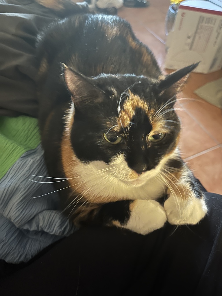 This stunning tortoiseshell and white beauty is all about chin scratches, face bunts, and peaceful vibes. From the moment you open the door, she greets you like an old friend, pressing her face into your hand as if to say, "Finally, my adoring fans have arrived!"