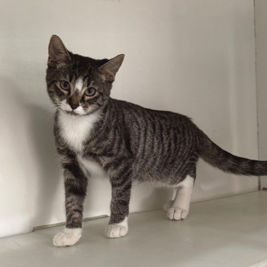 Mocha is a sweet Tabby and White, Domestic Short Hair male kitten looking for his forever home! He is a sweet shy boy who will need a quiet environment to be able to settle and bring out his loving personality!