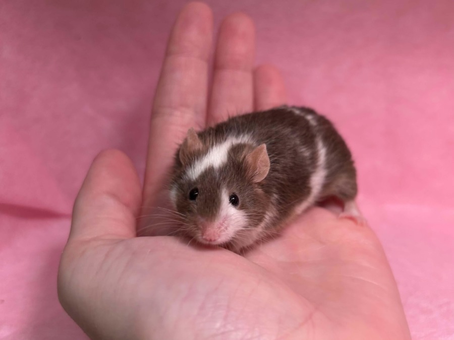 Meet Kreature, an inquisitive young mouse with a chill attitude. This placid dude craves having lots of choices in life, such as room to explore, the ability to burrow and build nests, and cozy hammocks to climb to. With a fluffy chocolate coat and striking white markings, Kreature is absolutely adorable.