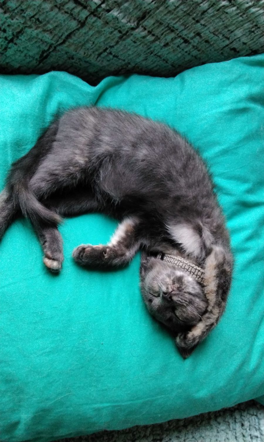 When she came into care at 8 weeks of age she was tiny, with an equally tiny voice. But she has made up for her size with her energy and playful antics. She has a curious and adventurous nature and is always looking to see what mischief she can get into. She eagerly investigates any new toys which are on high rotation to keep her interest, but is just as happy playing with a scrap of paper. She has won over the older slightly grumpy foster cat, and they are regularly seen playing and chasing each other. She also likes to play with (and sleep near) the gentle resident dog.
