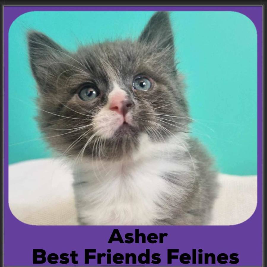 Asher is a gorgeous little guy with the softest gray fur that came into care at barely a day old. His mama needed some help looking after her boys, so Asher has grown up with a bottle baby attitude. He loves people and comes running when he hears/sees his carers and climbs into their lap or on their feet while asking for cuddles with his little voice.