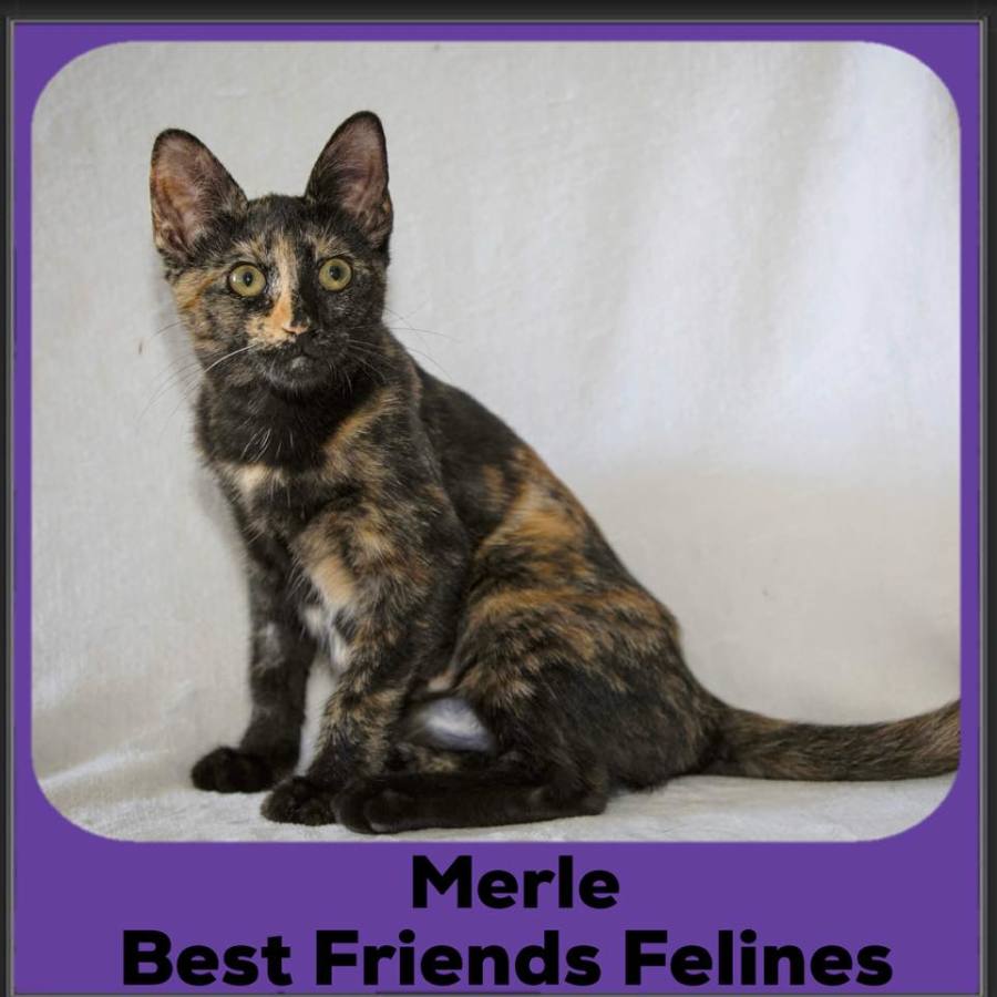 When she’s not busy playing or exploring, Merle enjoys snuggling up for some well-deserved rest, curling up in a cozy spot including your lap if it is available or helping you on the computer. Merle’s purr motor starts working as soon as she is picked up. She would thrive in a home with another playful kitty or lots of human company to keep her entertained with fun games and affection.