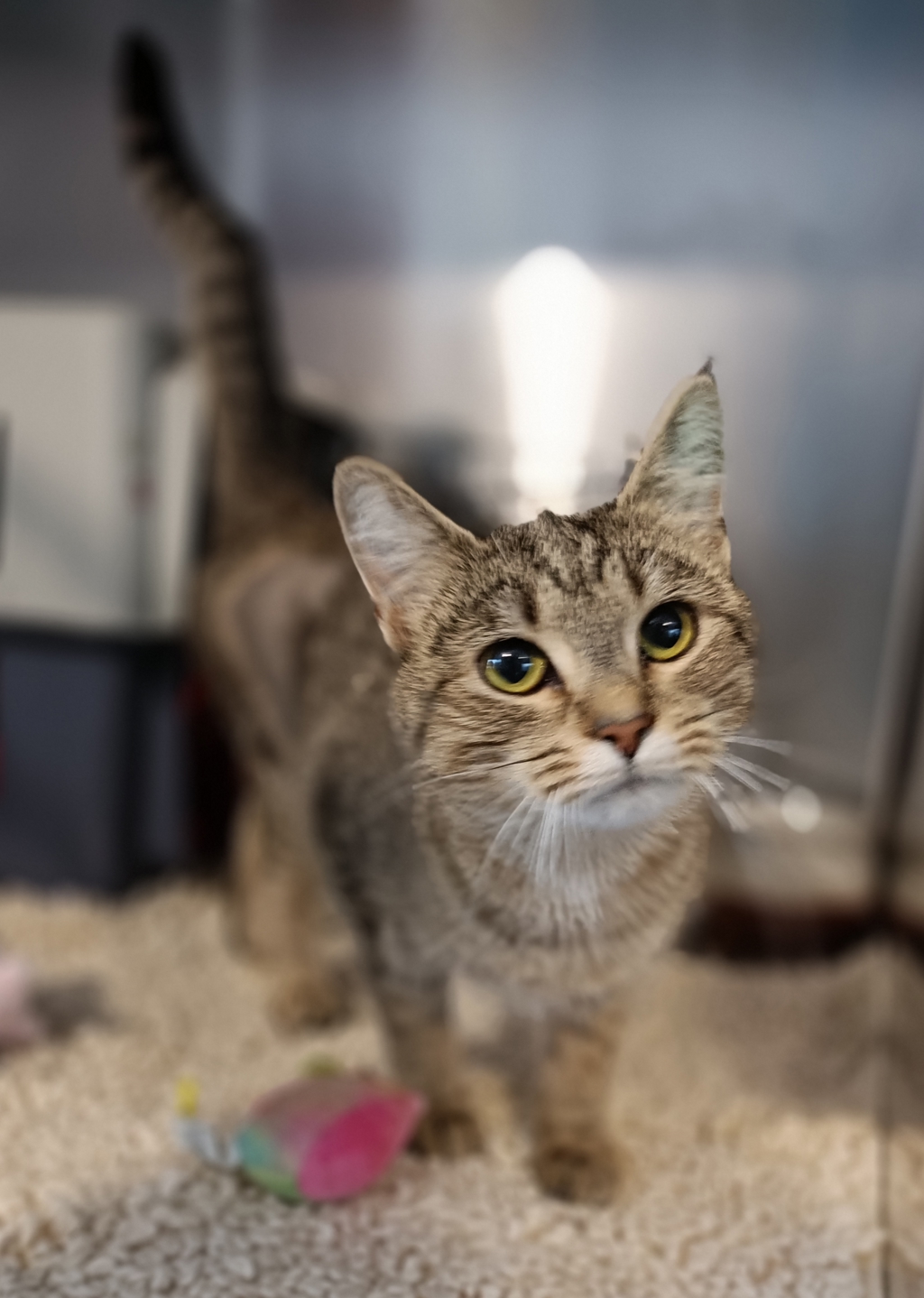 Dulcie is a delightful 9-month-old tabby who's looking for her new forever home. With her sweet and affectionate nature, she'll quickly become the cuddly companion you've been searching for. Dulcie loves spending time with people and is always ready for a gentle cuddle or a soft purr.