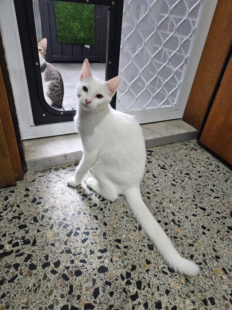 Looking for a kitten who's both playful and cuddly? Meet Flake! ❄️ This sweet little white girl, from our "Snow Family" (Frosty, Spring, Summer, Jack), is a bundle of joy and affection! She loves to play, pounce and growl playfully with her toys, but she also loves to purr loudly and rub against you for attention. 😻