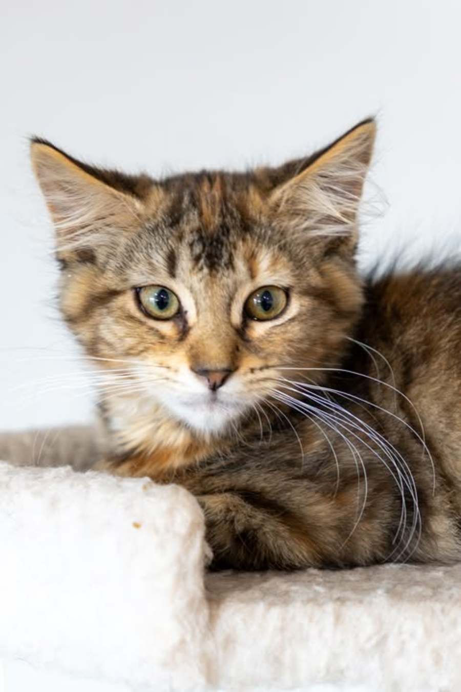 Kiki is a sweet 4-month-old tabby who is still learning to trust the world around her. Naturally shy, she prefers to observe from a safe spot, but with patience and the right approach, she’ll reward you with soft purrs and gentle head bops. She’s slowly coming out of her shell and gaining confidence every day.