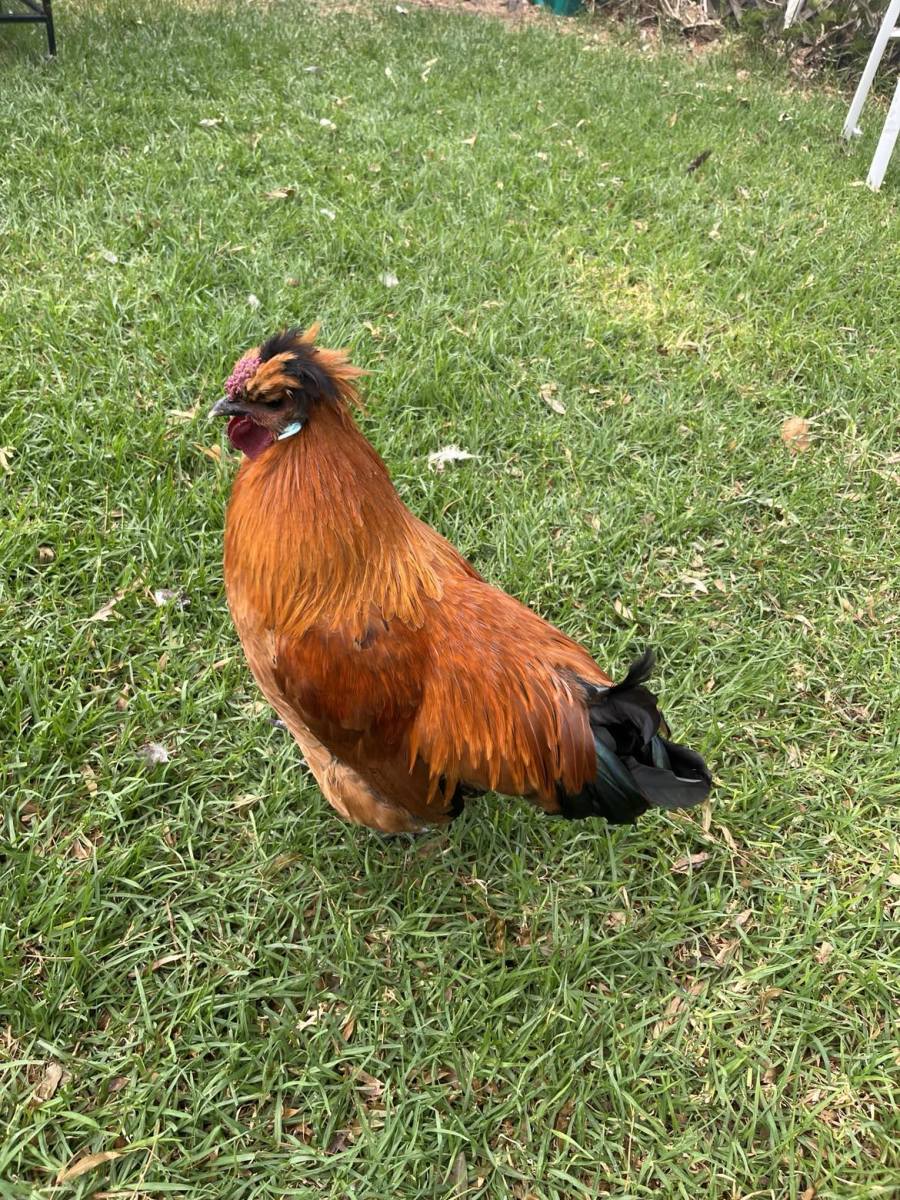 My mum Bettie is a silkie and my dad Bert is a Polish Rooster. I have my Father's good looks and my Mother's kind heart. I'm only small, about the size of an Isa brown.