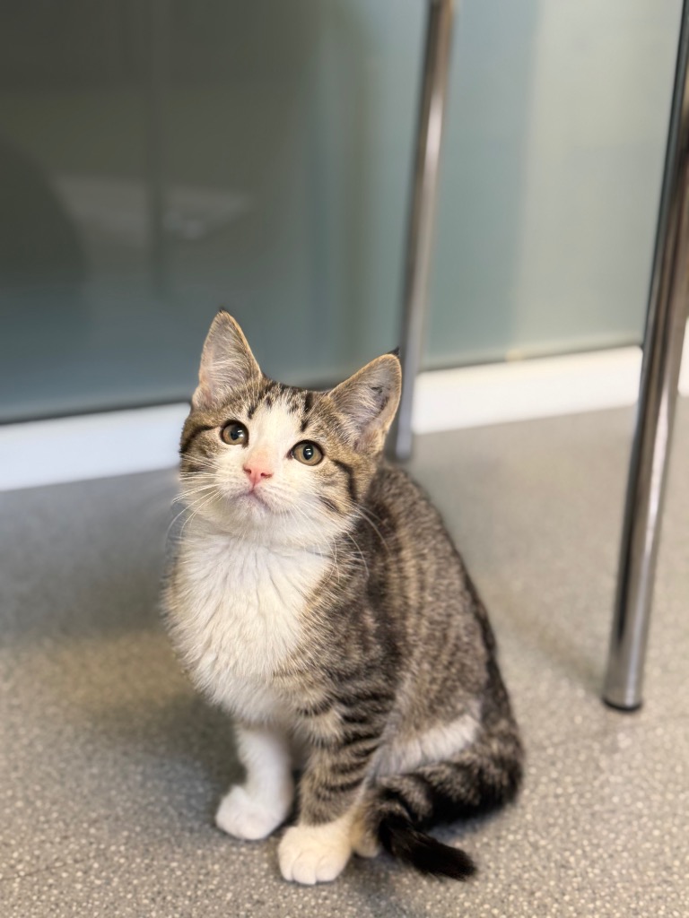 Princess came to us through our Last Litter Program and has been winning hearts ever since! This 10-week-old tabby and white kitten has a playful spirit and a love for cuddles. She adores zooming around with her brother Tux, chasing toys, and of course, mealtime. Full of charm and curiosity, Princess is always ready to explore or curl up in a warm lap. Come and fall in love with Princess at our Longford Adoption Centre!