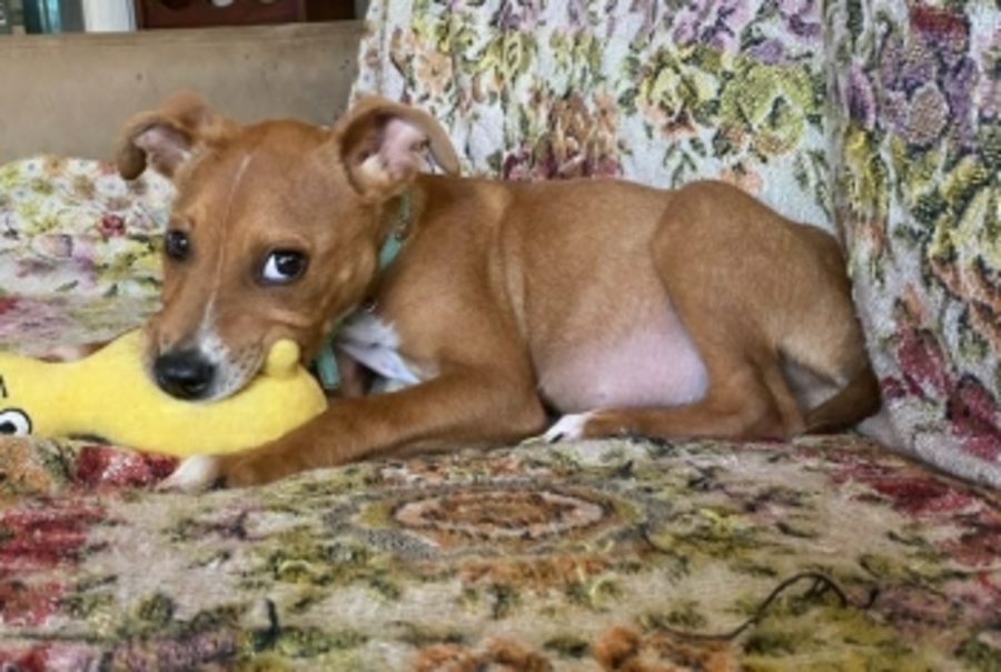 He enjoys cuddling with you but is also happy to stretch out on his own on the couch, dog bed or floor. He is learning about house training and has learned to sit. He is highly food oriented so further training should be easy.