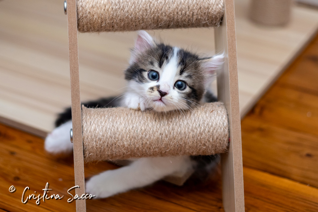 Tipsy loves to athletically scale the cat tree to play with the dangly toys hanging from it. She loves playing with anything that will wiggle and waggle. And she also loves pom poms. Tipsy is often seen running around the house with a pom pom in her little mouth, taking it somewhere secret to play away from her brothers, ever so proud of her precious treasure.