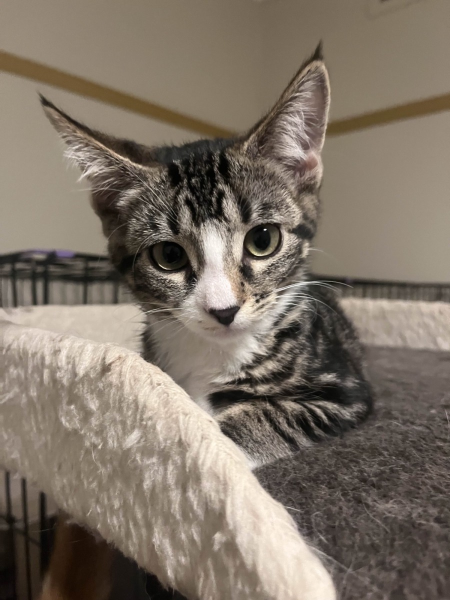 Petunia is a delightful combination of snuggly and spirited, always ready to unleash her playful side when the moment calls. Don't be surprised to find her curled up comfortably on your shoulder, as this little cutie loves nothing more than being close to her favorite humans. This balance of loveable companionship and lively playfulness makes Petunia a fantastic fit for anyone looking to embrace the energy and excitement of kittenhood.