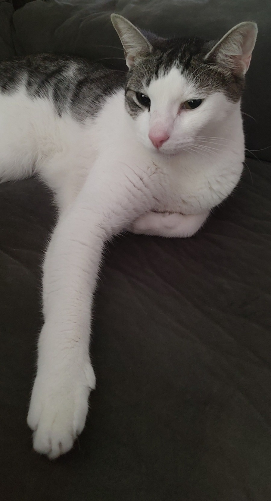 His greatest joy is a soft couch or bed to snooze on. He will leap up to your hand for head pats and is happy for any attention.