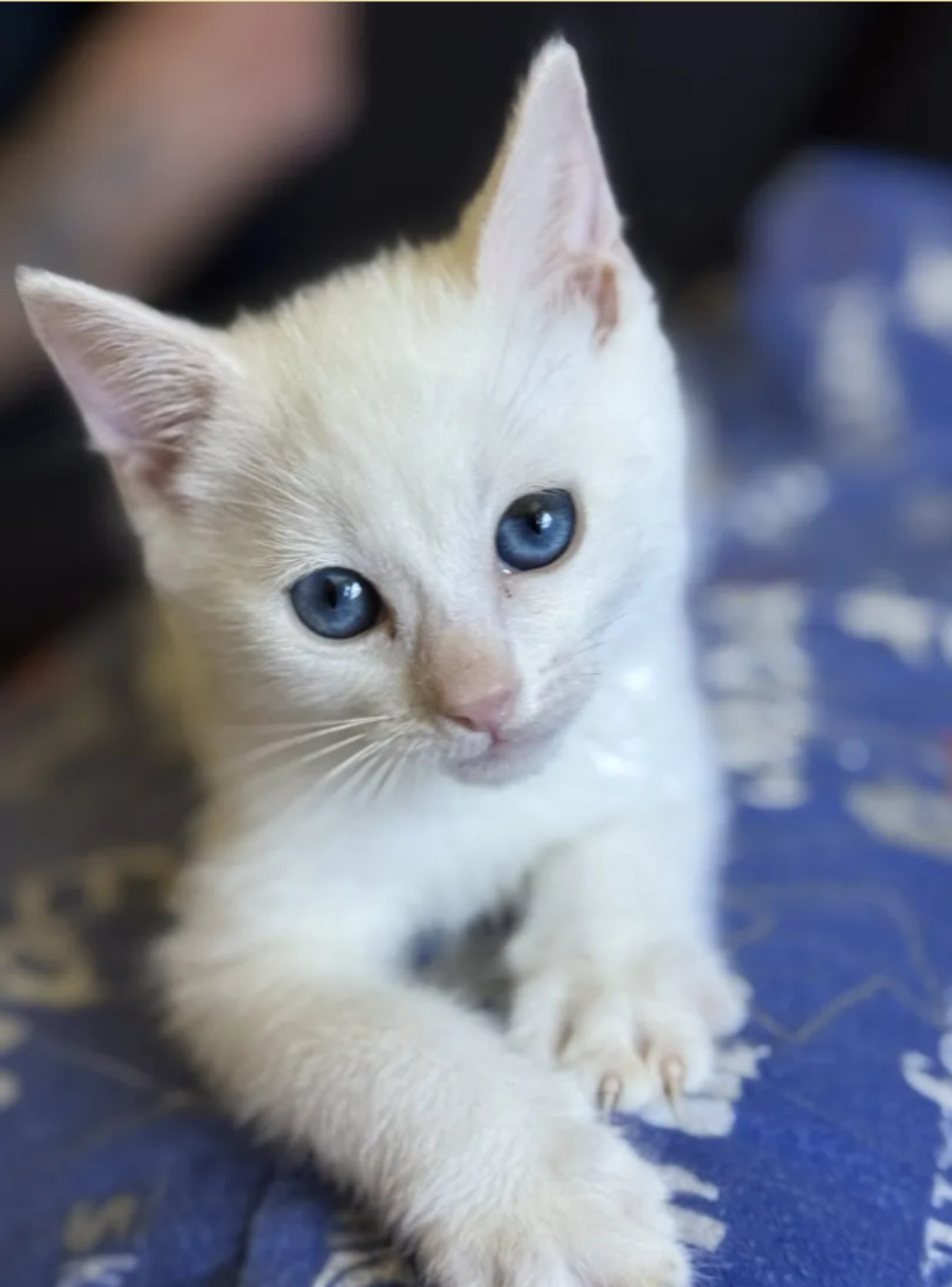 Olaf and his sisters, Elsa and Ana, were rescued from a demolition site just in time. With his snow-white fur and striking blue eyes, Olaf is a special little kitten who wouldn’t have thrived as a TNR cat. Now safe and sound, he’s ready to find a loving indoor home where he can shine.