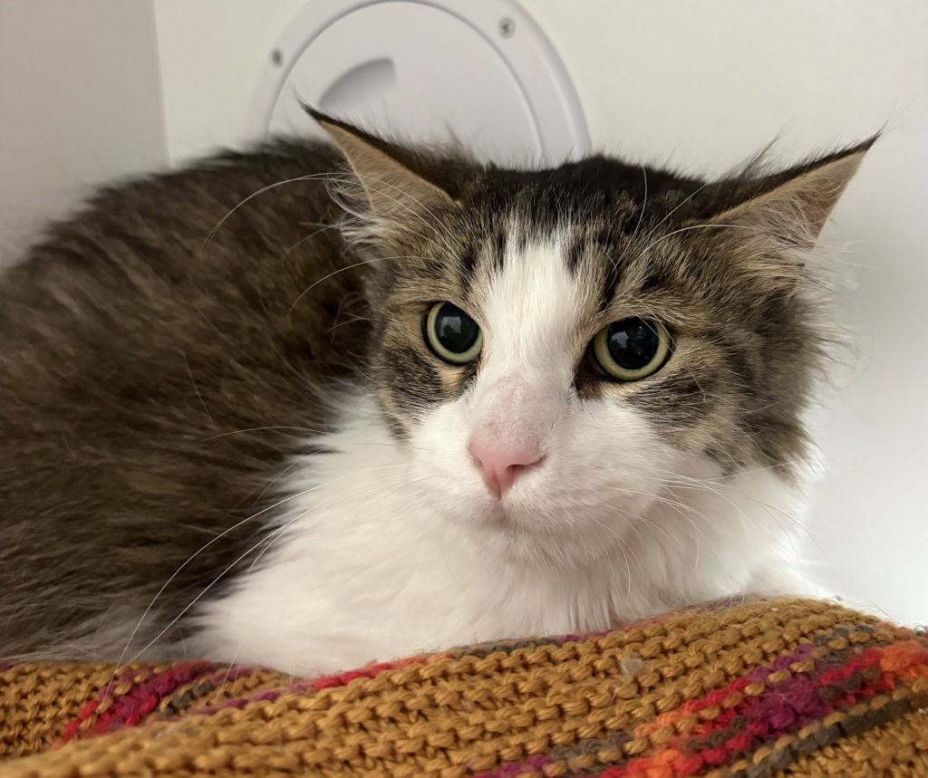 Bandit is a little shy when he first meets people but lets his sweet personality out once he gets to know you. He has a pink nose so needs to be an inside only cat to protect him from the harsh sun. Bandit would suit a quiet home with no little kids, but teenagers would be okay for him, and he would be best in a home with another cat to keep him company and help settle into his new home. Hell also need weekly brushing to keep his longer fur looking handsome. If you'd like to meet this sweet boy come to the cattery any day between 11:30-3:30.