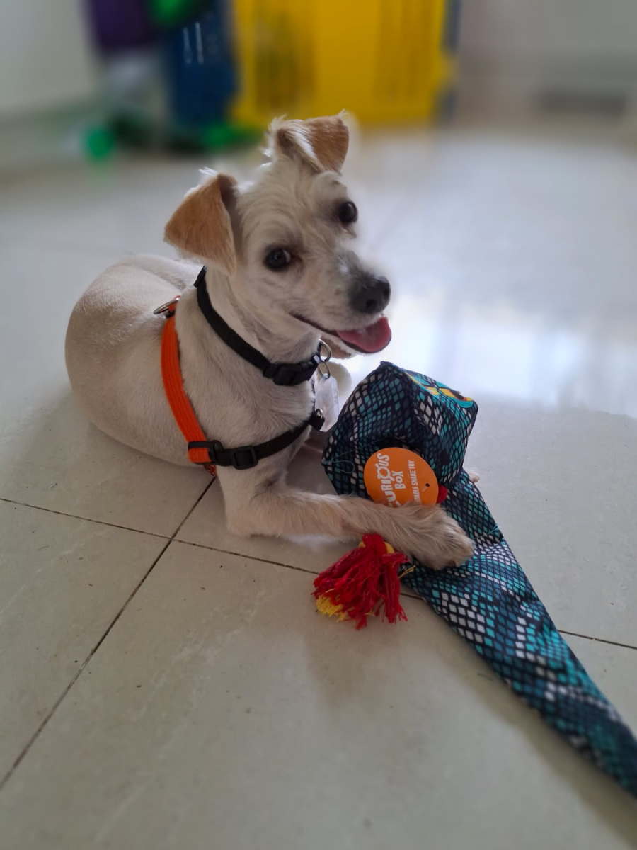 Meet Atticus, the remarkable young dog who's as calm and chilled as he is charming. This one-year-old Maltese/Jack Russell Terrier mix is a perfect blend of gentle demeanor and playful spirit, making him an excellent companion for families or individuals alike. With his striking appearance and serene nature, Atticus is sure to capture your heart.