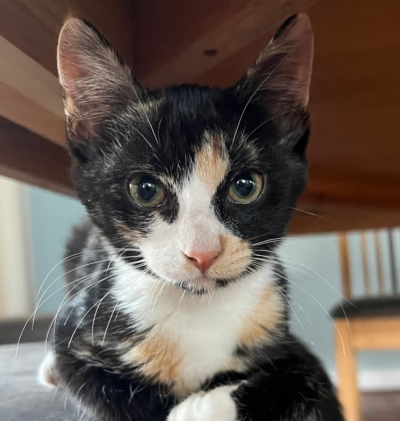 Spotless is a sweet and gentle kitten with a lovely nature. She loves being close to you and will even press her head against yours to show affection. She’s super clean, enjoys her food and has settled well around a dog and young children.