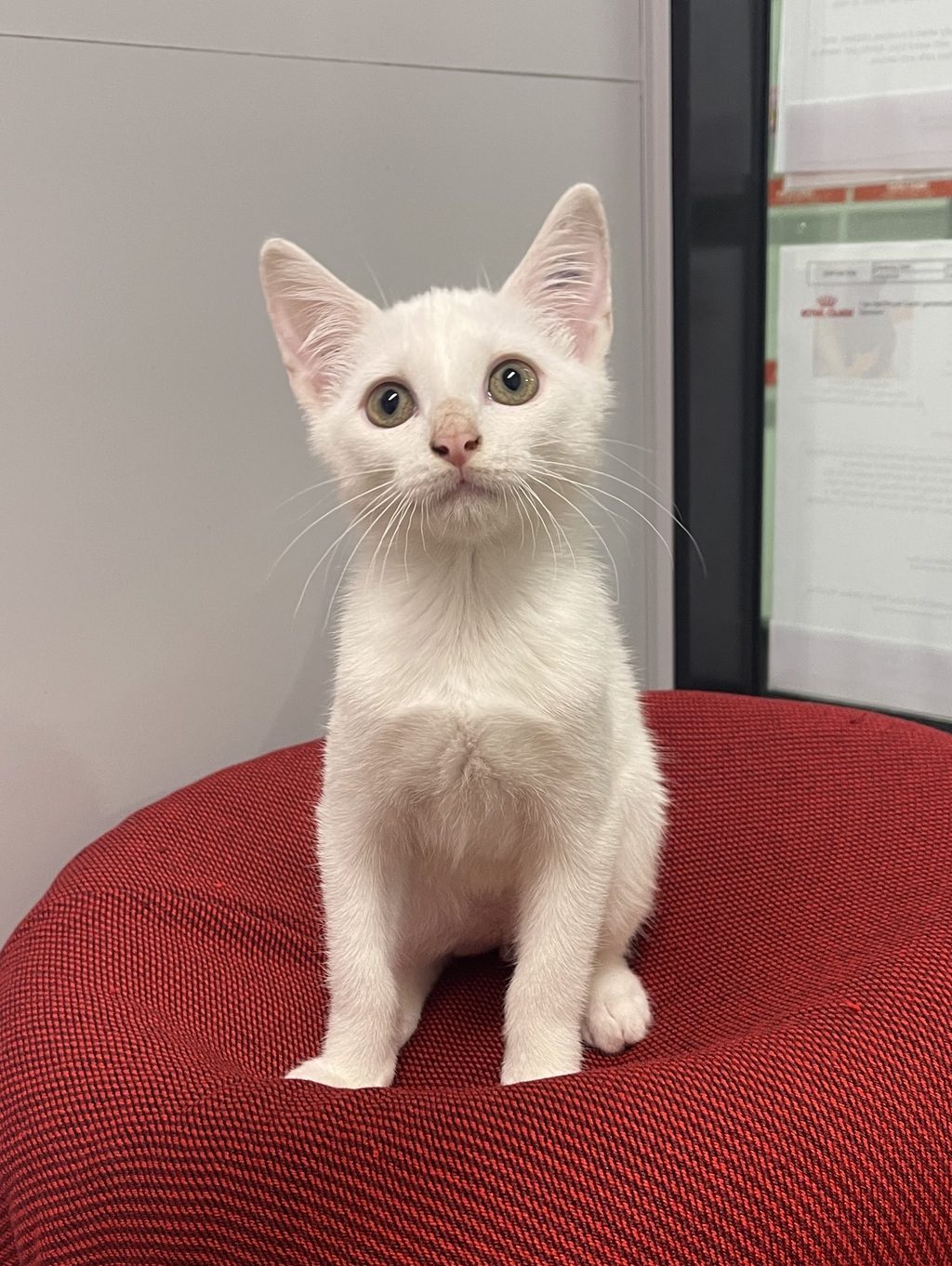 Brush is a sweet, pure white kitten with a shy nature. Though initially timid, this little one warms up quickly with patience and love. Once comfortable, Brush shows a playful side and enjoys snuggling up for cozy moments. With time, you'll see their gentle and affectionate personality shine through. If you're looking for a kitten who needs a little extra time to trust but will reward you with unconditional love, Brush is the perfect companion. Give this precious kitten the chance to blossom into a loving friend for life!