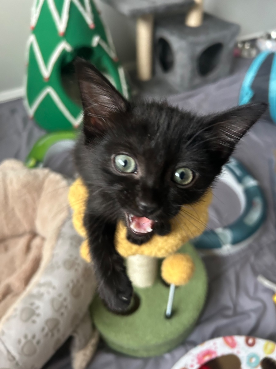 Hi there, I’m Binx and my foster parents say I am the best of both worlds because I love play time and snuggling. I am super super friendly and love humans soooo much! For play time, I love playing with cat wands, chasing balls around the house, wrestling with my sisters - (Amity, Horizon and Night-fury) and climbing up and down scratchers.