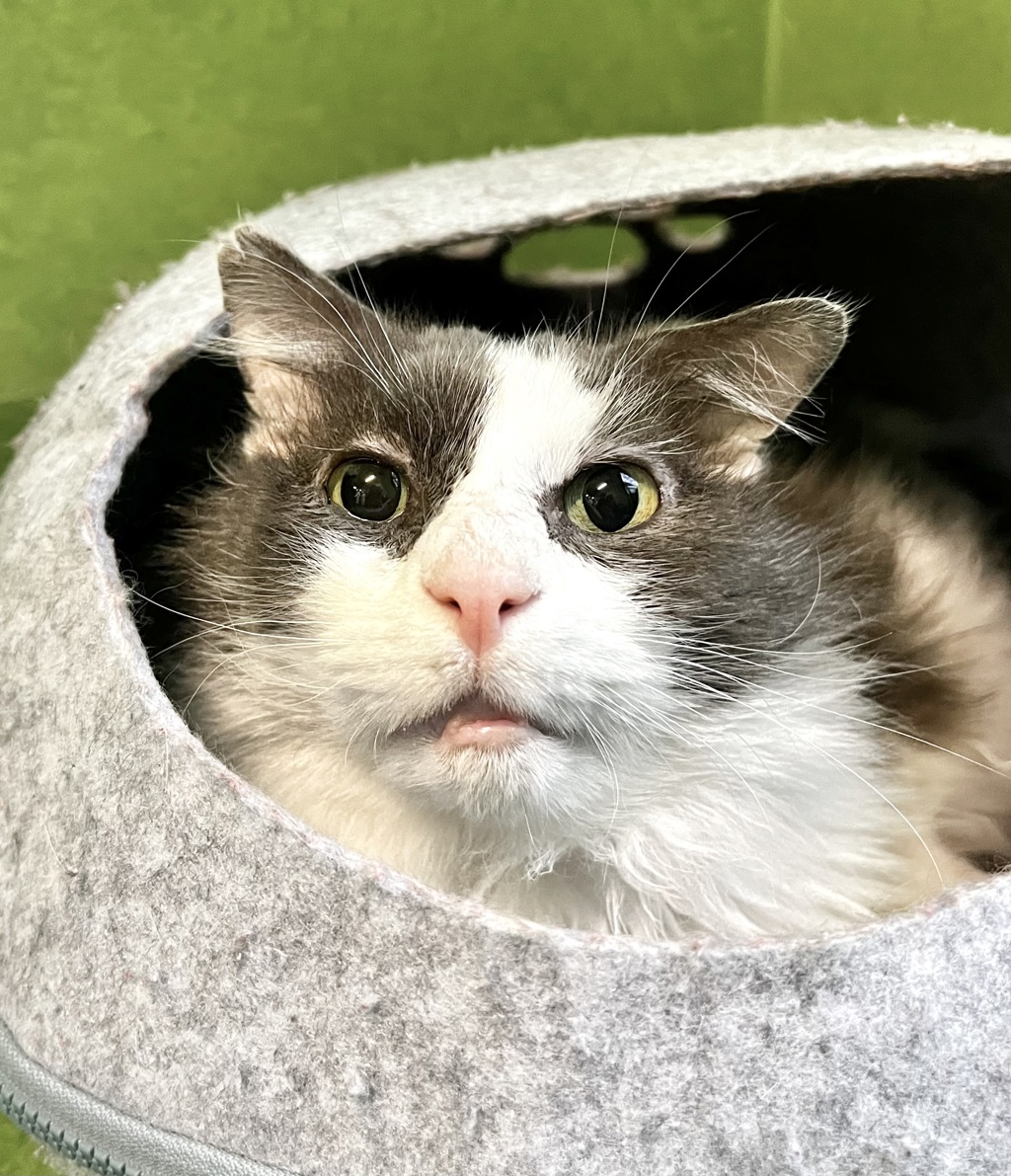 He has faced many trials but remains affectionate and brave. Though wary of loud noises and sudden movements, he quickly regains his courage. He seeks a peaceful, predictable adult home where he can rest upon soft thrones and enjoy gentle companionship. While he enjoys the occasional skirmish with a toy, he is more inclined to bask in the warmth of companionship. A calm and loyal companion, he prefers to rule his realm alone, without other feline knights. He is not suitable to go to a home with young children as he can become overwhelmed by them.