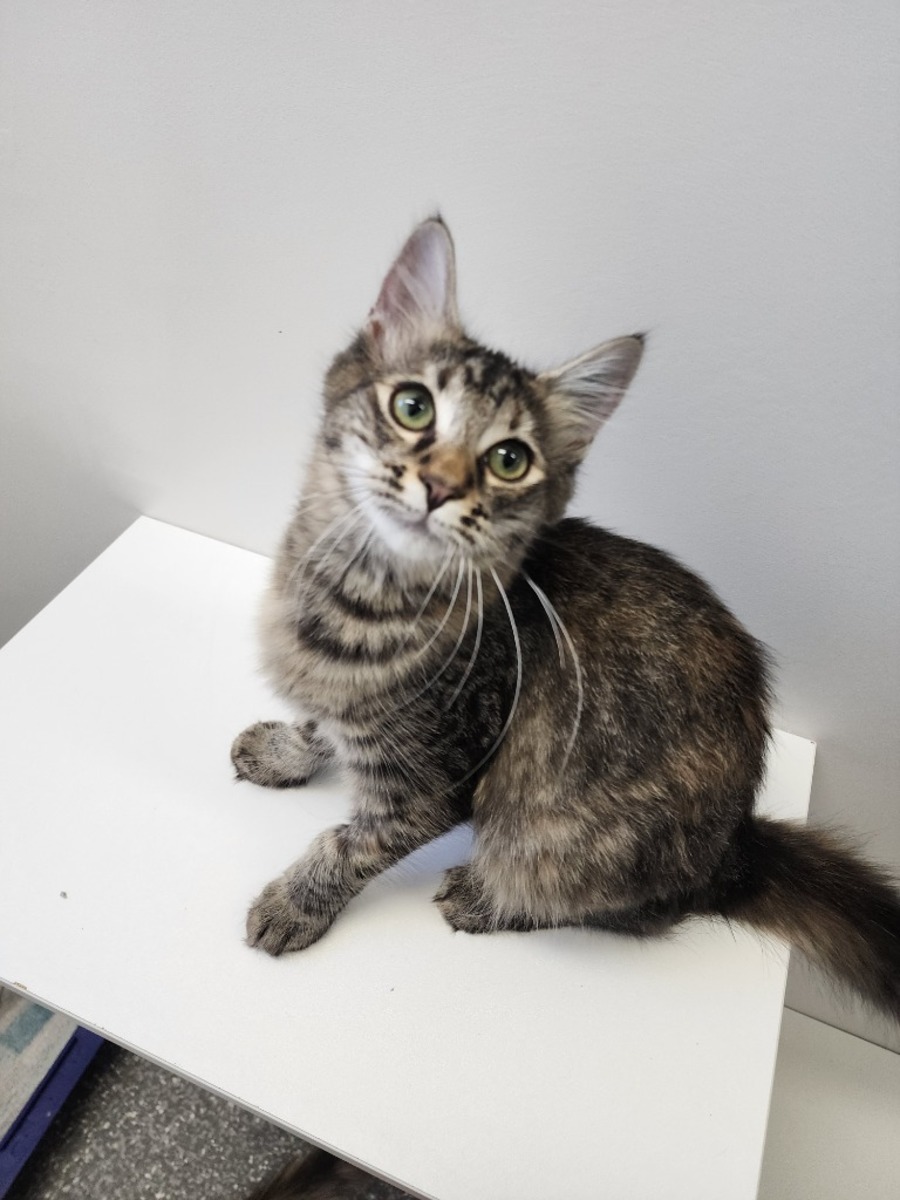 This playful little girl loves chasing toys, investigating mysterious corners and occasionally launching into a sprint across the room, for reason only she understands. She has got kitten energy to spare and a heart full of love, especially for children who can keep up with her antics..