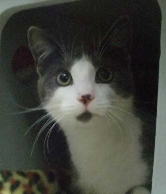Hi i'm smokey and i am a sweet little boy who was surrendered over as my owners cat didn't like me very much. I am a little shy but i am affectionate. I love pats and i particularly like chin rubs. I don't mind other cats, but i would like a quieter home. Please come and meet me!