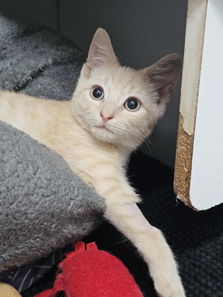Hey there, I'm Vector. I'm a friendly and affectionate kitten who would suit most homes! My playful paws are always ready to pounce on anything that moves. I love playing with wand toys and mysterious shadows on the wall! When I'm finished playing, I love nothing more than finding a warm lap to curl up in.