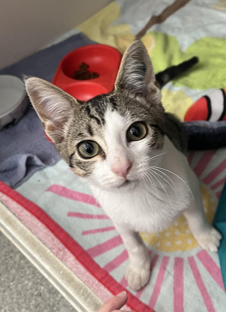 She is a confident kitten who loves exploring and playing with toys. Once she gets her energy out, she’ll happily cuddle up in your lap for a well-earned nap.