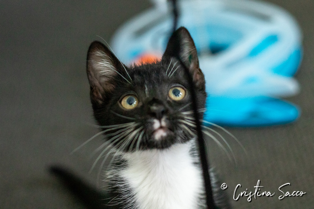 Oreo is a kitten who knows how to play! He loves all the toys he is presented with. He is a ball of energy who loves to run, jump, and explore, running through the kitty tunnels at record speed and climbing to whatever heights he can reach. And we can't decide what is cuter: when he finds his favourite toy on a string and carefully carries it with him to his favourite play spots around the house, or watching him play with his own toes all afternoon. His playful nature and silliness is truly infectious and totally endearing.