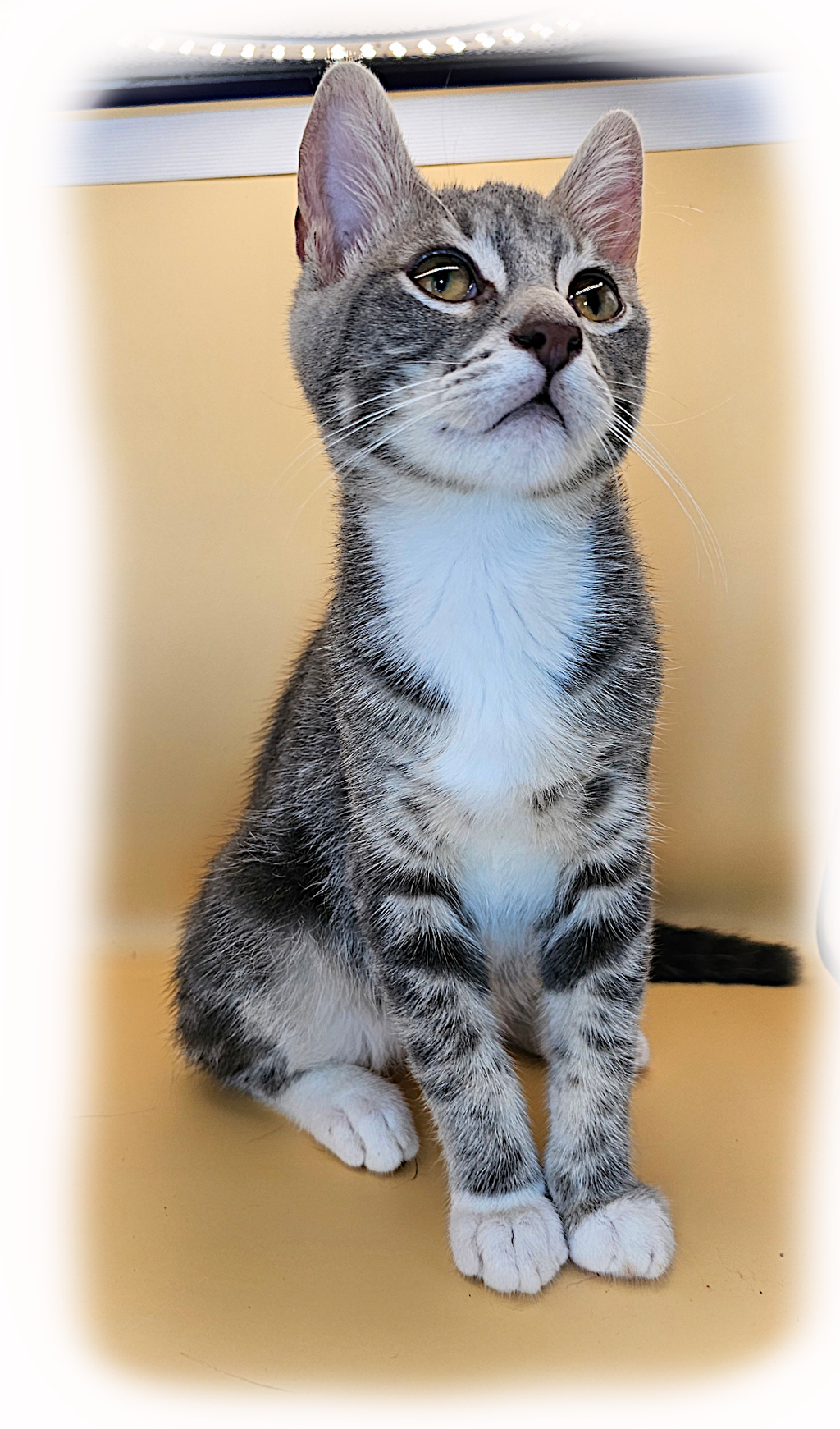 Sid, a 6-month-old silver tabby kitten with stunning silver-rimmed eyes and a heart full of love.