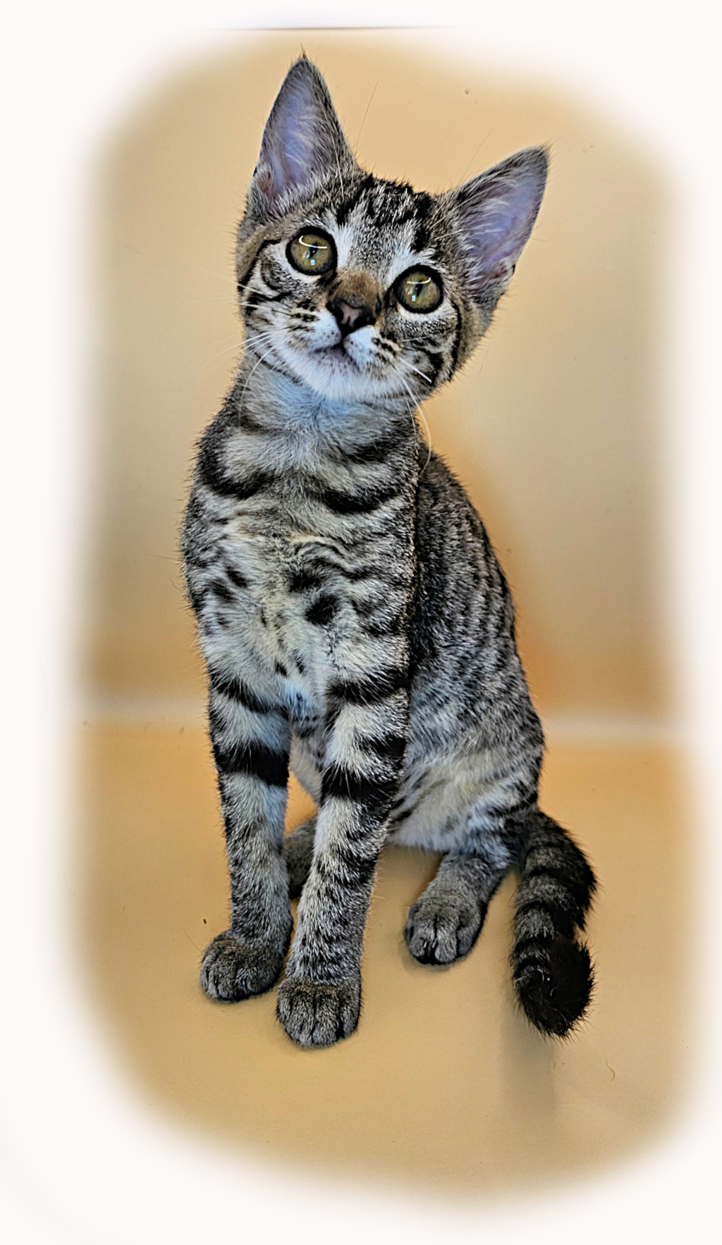 Newt, 4 month old tabby girl who's tiny in size but has a big personality and heart! She will be your dog's new best friend and the perfect little queen for your castle.