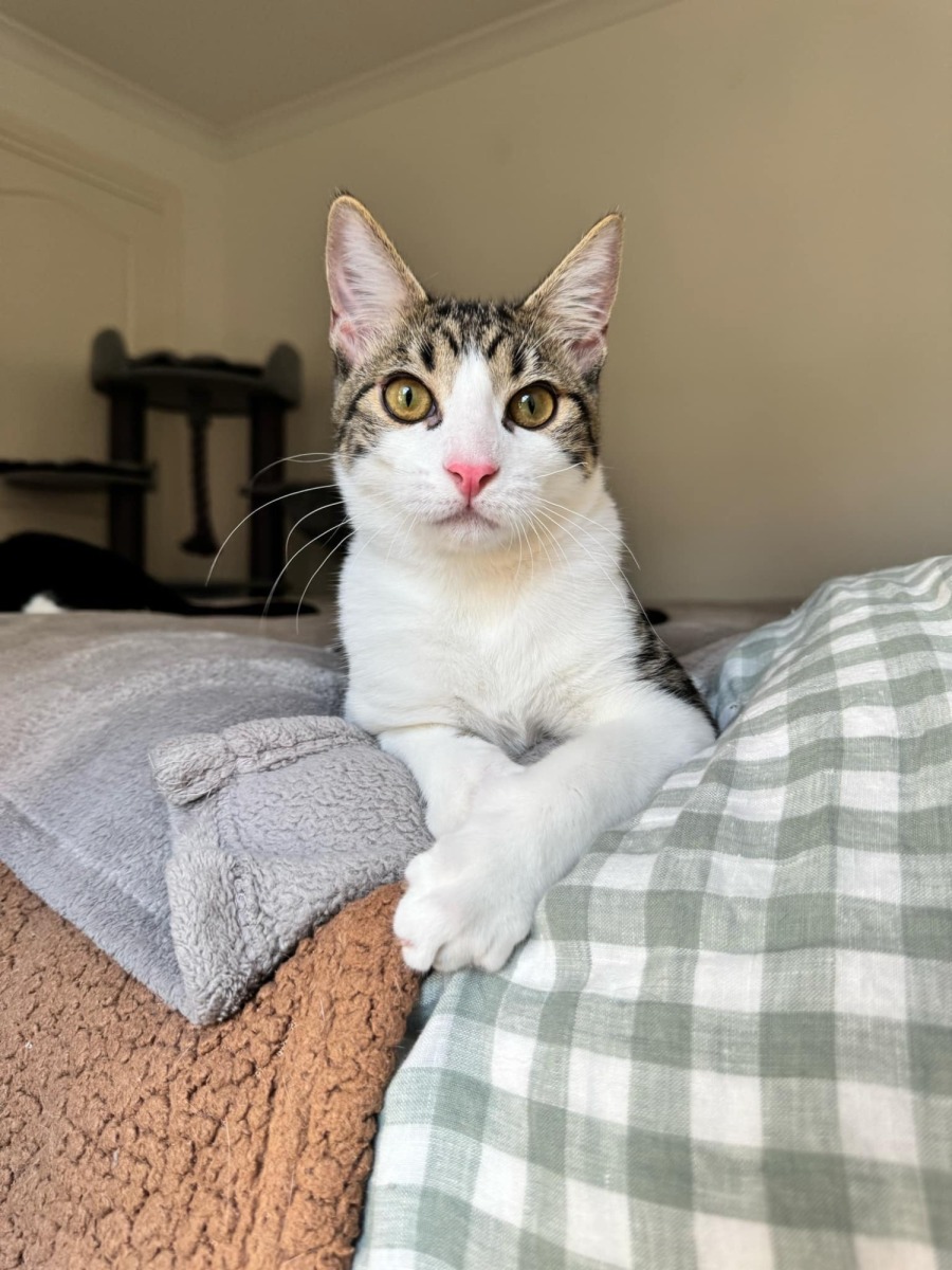 When he’s not purring away contentedly in your lap, Fish thoroughly enjoys leaping and bounding for feathers on a wand or chasing bouncy balls and tiny colourful spring toys up and down the hallway! At night time, he will curl up by your side and keep you company. 😻