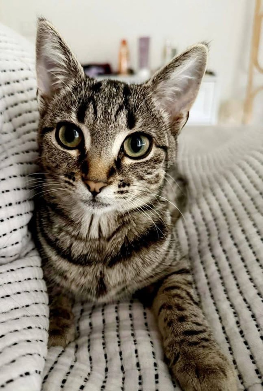 Bella’s a shy and gentle kitten, food motivated, playful, hardly meows, will slowly approach for a cuddle on the couch and happily purs sleeping next to you for a good night’s sleep. She will take a few days to come out of her shell, but will always want to be involved or around you when she’s out.