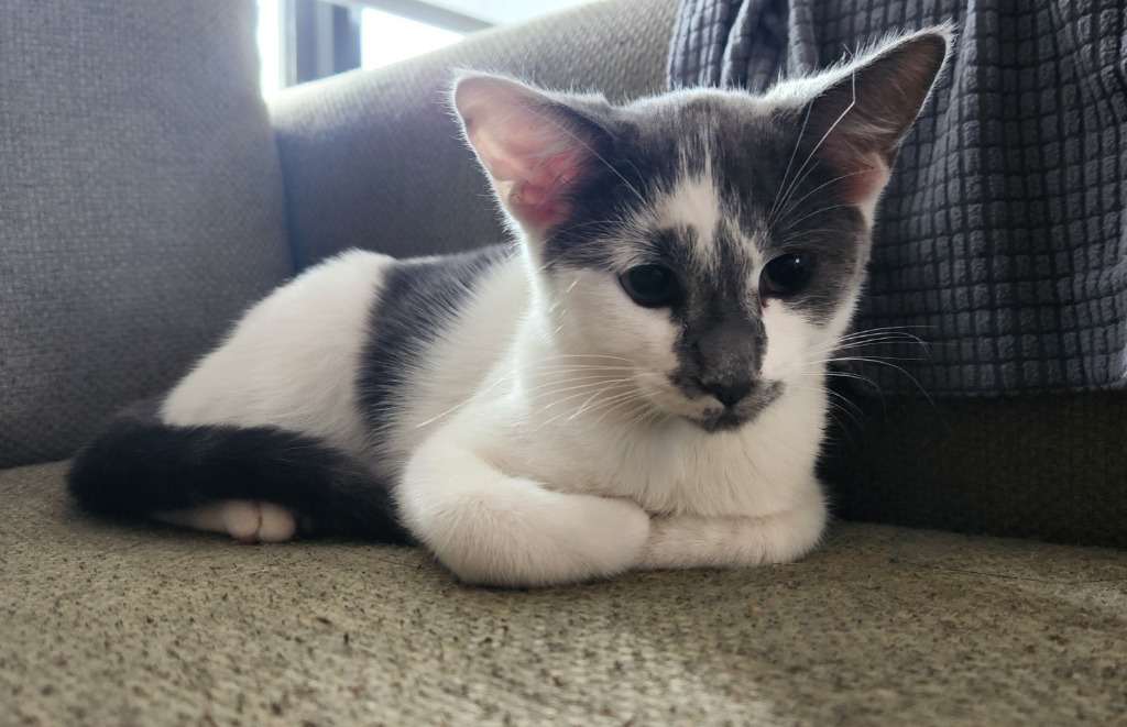 I have a lot of personality. I started out as the more confident one, who wanted to see what is in your bowl of food, and who would try to befriend the sleepy old resident cat. I rock my splotchy face and I am so soft to touch, and purr when I’m happy. I am very playful with my siblings, and with whatever anyone in the house wants to flick around with me or give me to climb. I even hear when someone starts to use the printer, and I go running into the room to try to watch the paper come out. I also stalk birds through the windows, so I think I’d be a wannabe hunter if outdoors!
