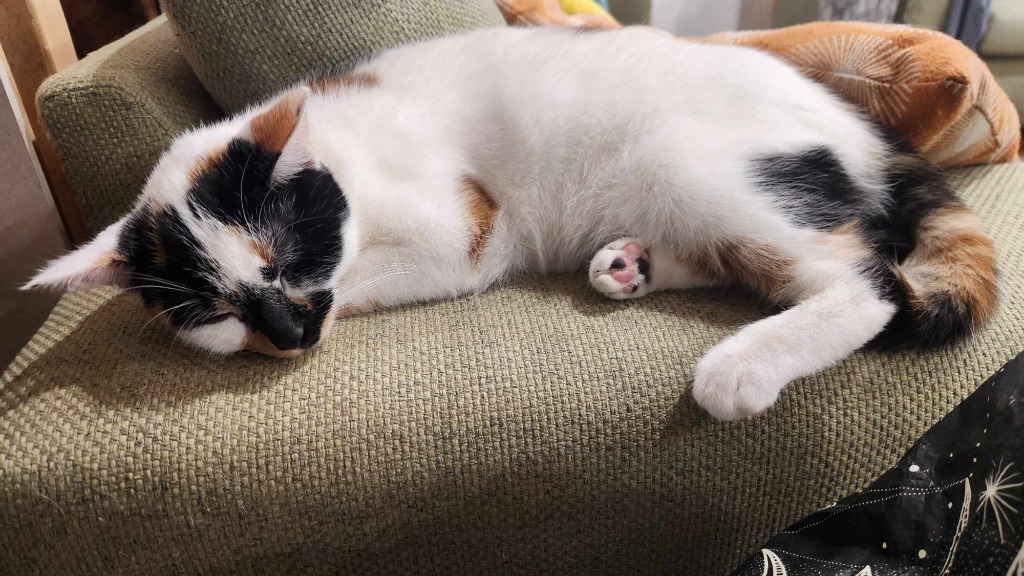 I am happy in a busy household. I’m currently in foster care with a resident cat, dog and young kids, and I’m happy living with any or all of these. I often take over the dog’s bed – check out the photos of me snuggling with the resident cat and others.