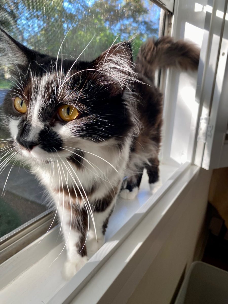 Shadow is a lovely cat. Sweet natured and very pretty - gorgeous yellow eyes and whiskers that go on for miles!
