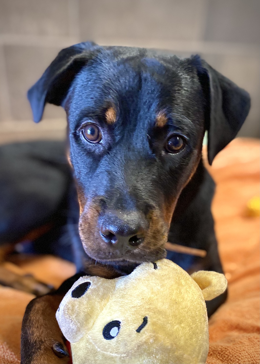 He has a special bear which he likes to carry around in his mouth. Axel does not want too much alone time; he is happiest being part of the family & included in all the action & fun!