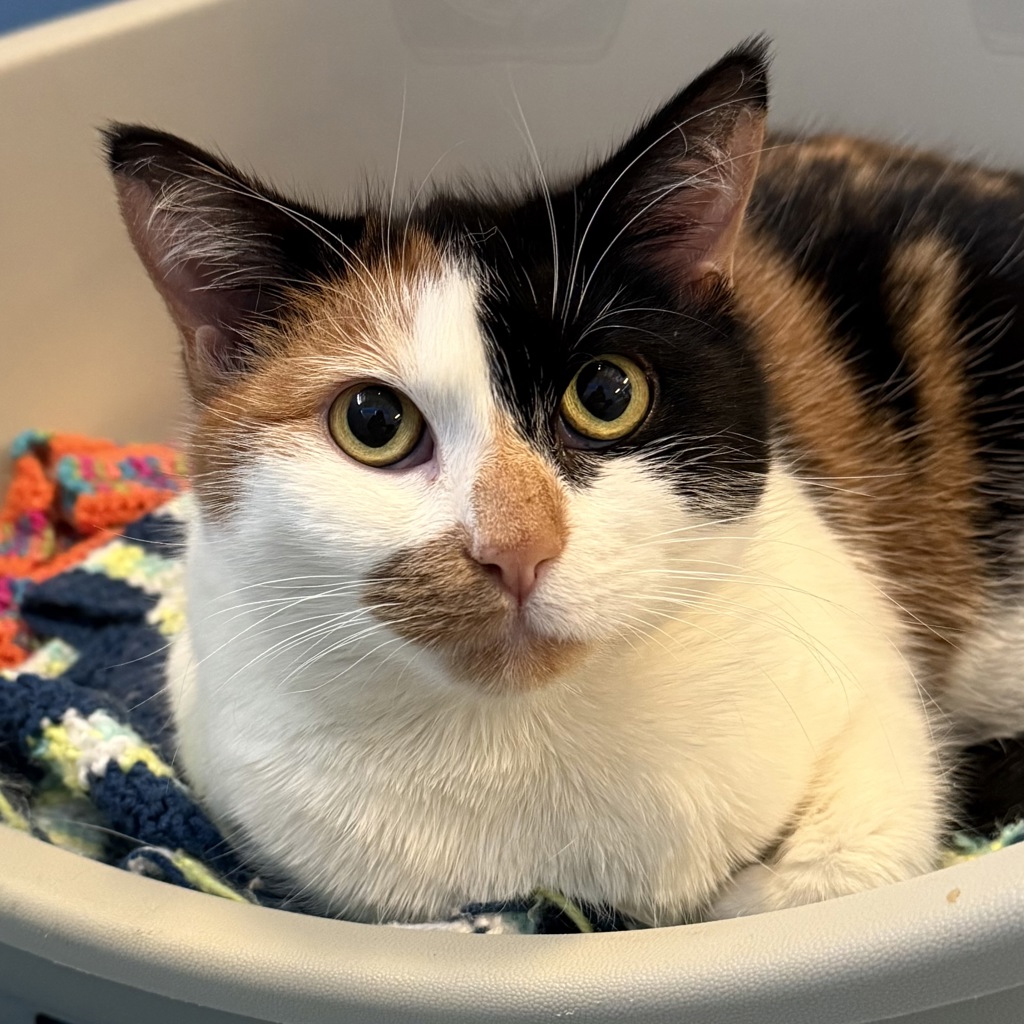 Murial is a sweet, shy girl. She needs to be an inside cat to keep her pretty pink nose safe. Little kids might be a bit much for her. She loves other cats so a feline friend would be great for her.
