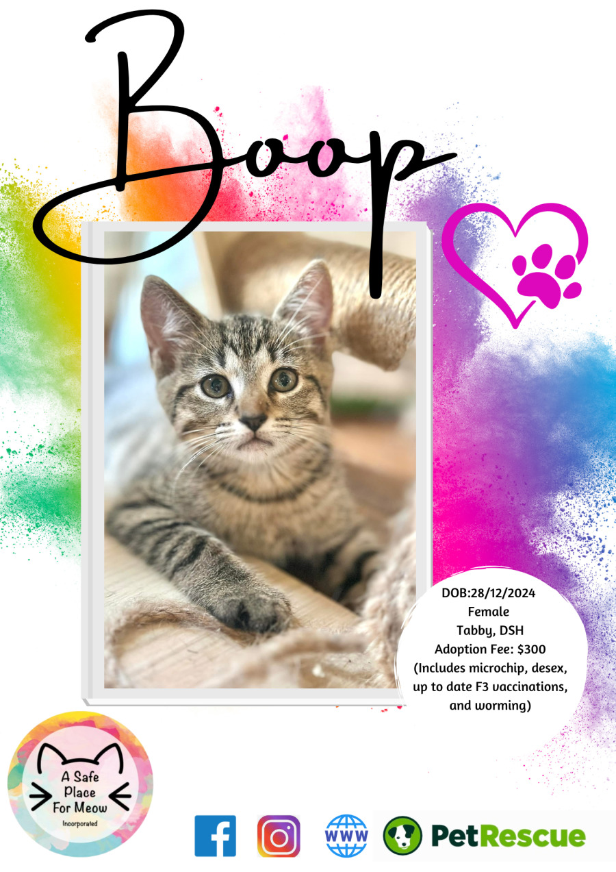Meet Boop, a delightful feline with a deep and curious nature that's sure to capture your heart. While they may start out a bit shy, Boop is an old soul who's steadily learning to embrace their playful side.