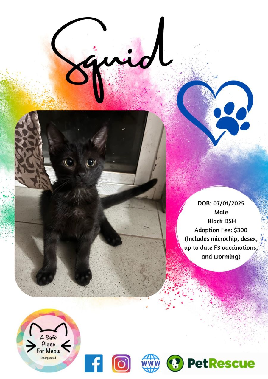 Are you looking for a kitten with the perfect mix of playful energy 🎉 and cuddly affection 🥰? Meet Squid, a lovable little black kitten who will steal your heart in seconds!