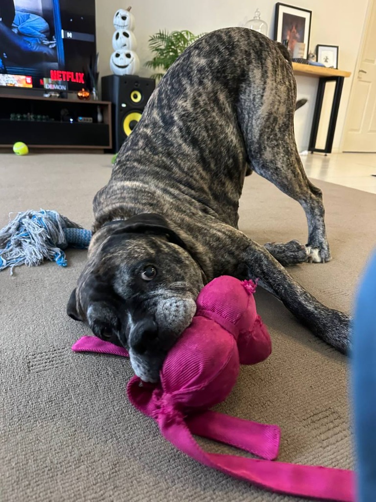 Despite his age, Zeus has so much zest for life. His favourite things are car rides, tennis balls, playing tug and chewing on squeaky toys. He has also shown his athletic prowess is still available when required (albeit in short bursts) which helps him get into the car or up on the couch for some cuddles. In foster care Zeus spends most of his days sleeping inside but if you're outside pottering in your garden then he's happy to be outside with you. At this stage of his life Zeus knows exactly what he wants and will tell you if he wants something (generally a play session or attention) with his mighty barks - thankfully this is done just through the day and it is possible to preempt and stop the barking before it happens.