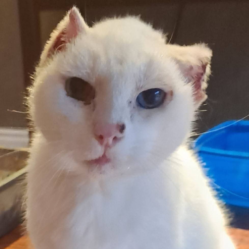 Beautiful Zuri has a history of sunbaking, which led to skin cancers on her ears and nose. The cancers have now been removed, and although she is missing the tops of her ears, it does not stop Zuri from living a full and happy life. Zuri has the most unusual eyes, having one blue and one yellow, so all in all she is a truly unique lady. She is an Olympic standard smoocher and conversationalist, and has confided that she is now in search of a family to call her own.