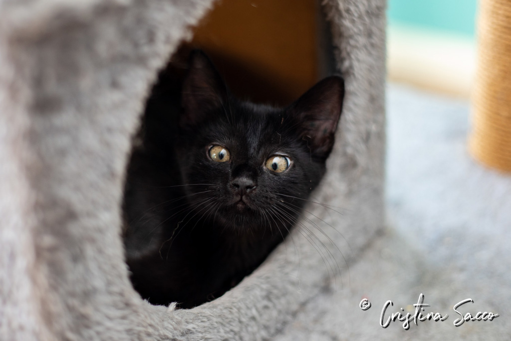 Princess Poppy is pure sweetness. She is a one-of-a-kind kitten will make your heart swell and spill over with love when you meet her. Her unique eyes and silky black coat combined with her playful spirit and affectionate nature will tug on your heart strings in the biggest possible way.