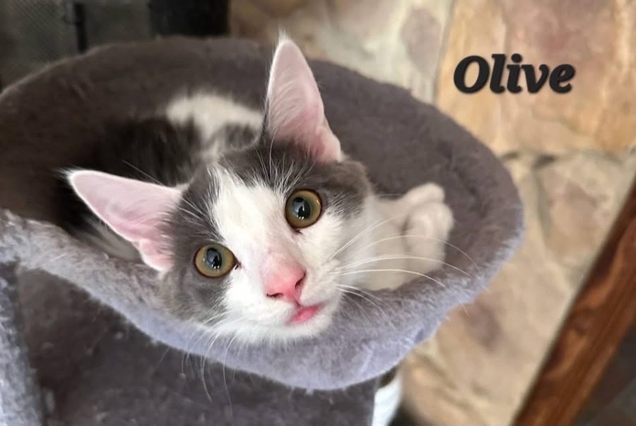 Olive is a small, playful kitten with soft fur that’s a mix of gray and cream, possibly with tabby markings. Her eyes are big and bright, filled with curiosity, and she has an adorable little pink nose.