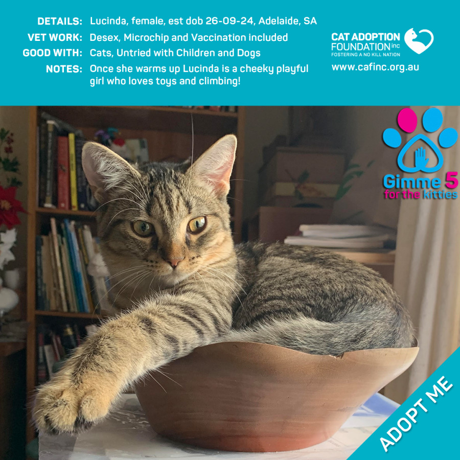 To adopt this kitty please contact Sayla on 0422 652 837 or email us at info@cafinc.org.au.