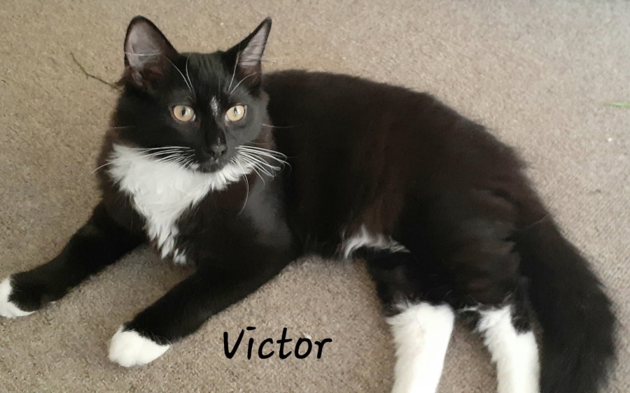 Meet Victor, an extremely friendly and fun-loving male kitten who is ready to find his new family. With his glistening black fur accented by a charming splash of fluffy white on his chest, tummy, and feet, Victor is simply irresistible. His sweet and laid-back nature makes him the perfect lap companion, constantly eager for pats and attention.