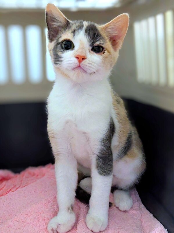 Hello there! I'm Raquelle, a 3-month-old Domestic Short Hair kitten. I'm a lady with a playful spirit and a heart full of love to give. My purrfect day includes chasing after balls, curling up in cozy spots, and showing off my adorable "kitten antics" that will surely make you smile. I'm also a fast learner, so I'm eager to learn all the house rules and maybe even a trick or two! I may be small, but I've got a big personality. I'm always up for a good cuddle session, and my soft, short hair is perfect for petting. I promise to shower you with endless purrs and cute kitten kisses. I'm looking for a forever home where I can grow and thrive. Could that be with you? Let's find out together!