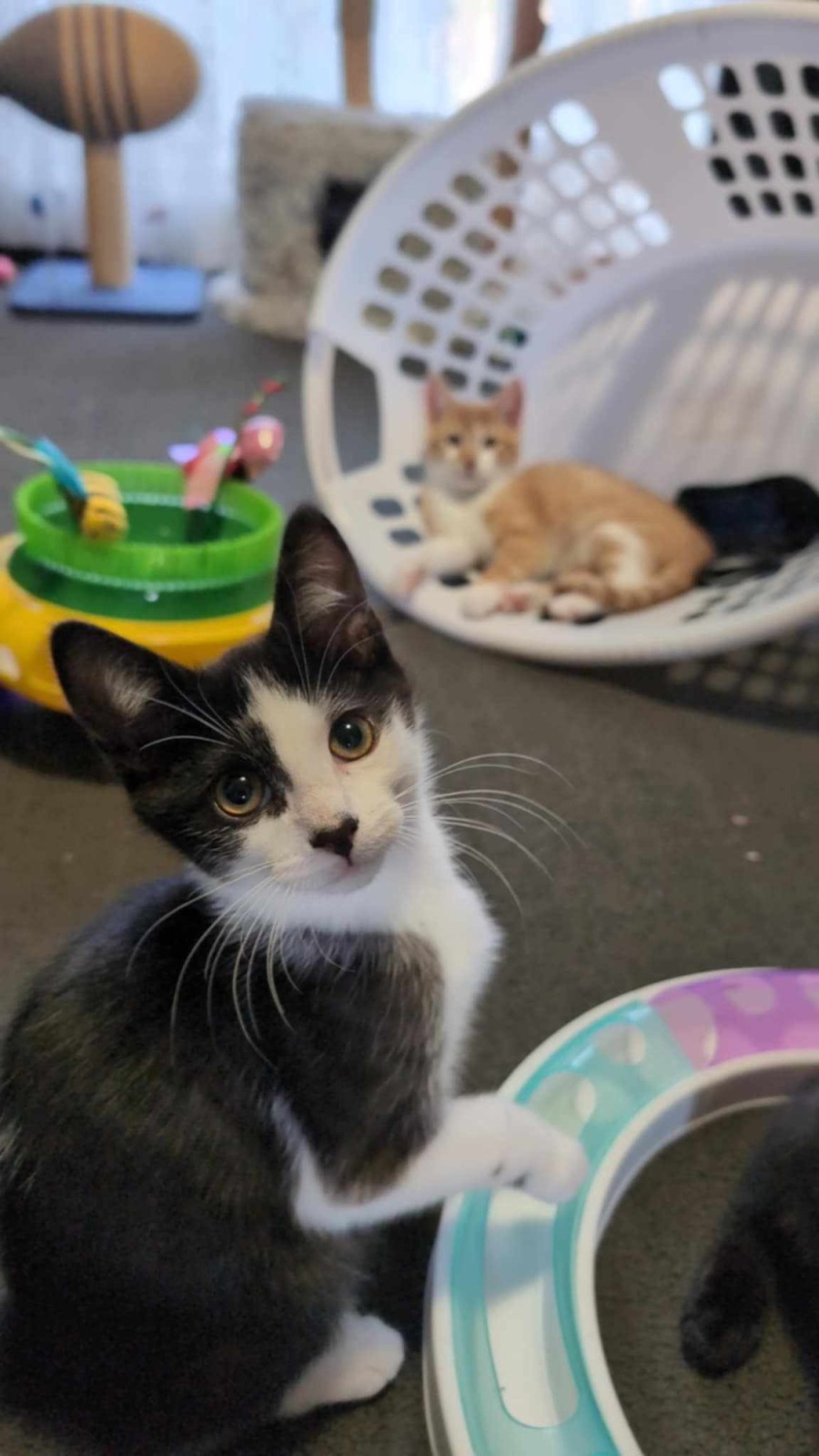 Vinnie is a quiet calm soul, he likes to take his time with life and think things through. When you earn his trust he will gift you with head bumps and tail wraps. Vinnie loves his brothers and was always keeping them safe, he has big brother energy and makes sure they are ok before himself. He will even clean his baby brother before himself and settling in. Loves small toys with feathers. His striped tux is amazing and the result of gene mutation affecting what would have been ginger colouring, and turning it black. So cool!