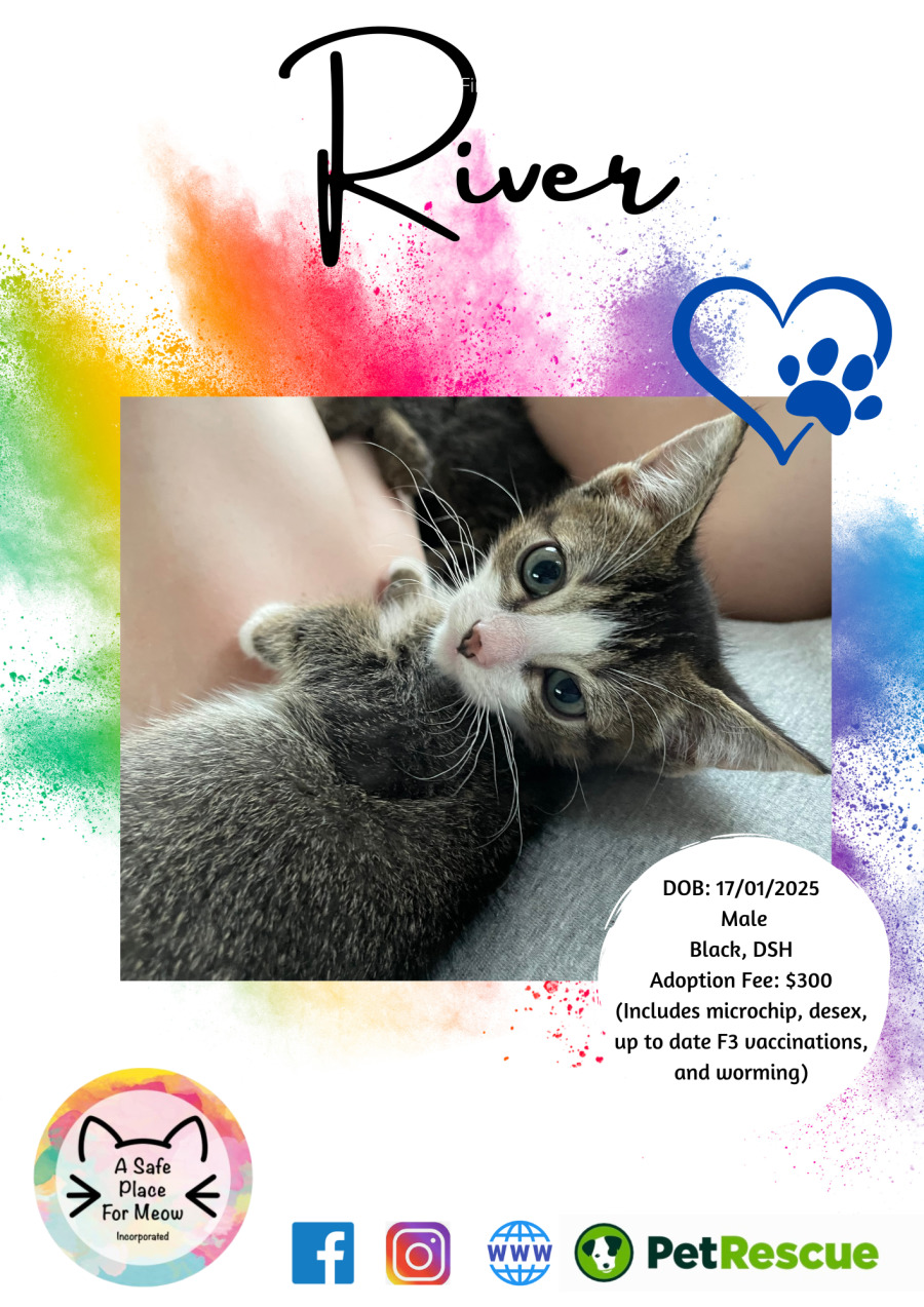River has had his first vax, and is up to date on his wormer, his adoption fee includes desexing for when he is a bit older.