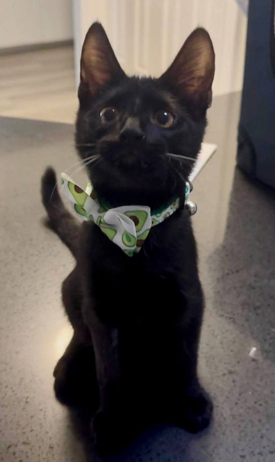 Hello there everyone! My name is Stanley and I'm a super handsome pretty much all black kitten with my sporty red collar. I say pretty much all black as I do have a little dash of white under my chin.