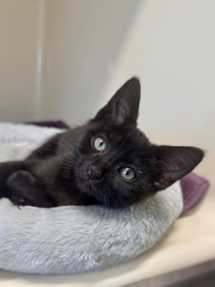 Herbert is about 10 weeks old . He is a domestic shorthair and has a beautiful black coat.