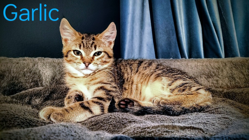 Garlic was found alongside his siblings after they were found under some scrap metal at just 4 weeks old. Garlic is a handsome boy with a huge purr and the confidence to match his tiger stripes. He loves to play chase with feathers and balls, and has proven to be very good with young children. He is very clever and responds well to his name, and will even chat back sometimes. Garlic is great with other cats and kids, untested around dogs but with a slow introduction should do well. Come and meet him at our Longford Centre.